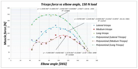 Applying the proposed methodology and using the finite element method, we can obtain the forces that must appear in the muscles involved in the elbow joint to keep it in balance, in any position between 44 and 164 degrees of opening, with a load applied to the wrist of 150 N (Table 2, Figure 13 and Figure 14).