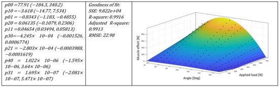 General formulation of the medium triceps efforts based on wrist load (W) and elbow angle (α) and surface reconstruction of the proposed polynomial.
