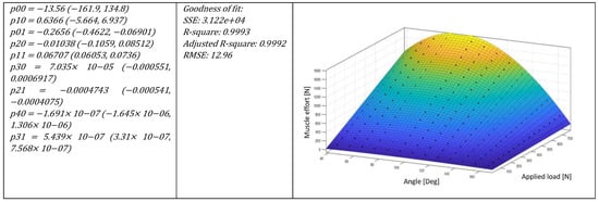 Through the application of classical mechanics and the balance of forces and moments in the joint, we can extrapolate the results obtained for a specific load, 150 N in our case, to different loads applied to the joint (Figure 15, Figure 16, Figure 17, Figure 18 and Figure 19).