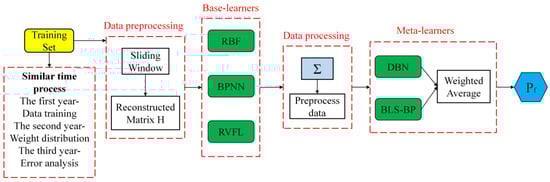 To address the above problems, we propose an improved hybrid predictive model, which includes a sliding-window algorithm, a stacking ensemble neural network model, and a similar-days predictive method. Specifically, a sliding-window algorithm [] is first introduced to directly process the nonlinearity and non-stationarity of the time-series electric load data. This method effectively mines spatiotemporal features of the time series. Furthermore, a stacking ensemble neural network model is proposed to improve the forecasting performance. The stacking neural networks contain two types of networks: the base-layer network and the meta-layer network. During the pre-training process, the base-layer networks integrate radial basis function (RBF), random vector functional link (RVFL), and backpropagation neural network (BPNN) to provide a robust predictive model; the meta-layer networks utilize a deep belief network (DBN) and the improved broad learning system (BLS) to improve predictive accuracy; the predictive results of RBF, RVFL, BPNN, DBN, and BLS are rationally weighted to obtain the final prediction result. Finally, the similar-days prediction method is developed to extract the relationship of electric load data in different time dimensions, further enhancing the robustness and accuracy of the model. This paper selects the load data of five regions in the United States for three consecutive years to conduct a large number of experiments, proving that the framework has high prediction accuracy and strong robustness.