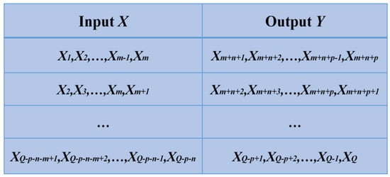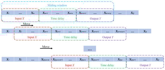 The principle of the sliding-window algorithm is to reconstruct the original power load data into a multidimensional matrix H by sliding the window. When training and validating the model, the reconstruction matrix H includes both the input and output data (also known as training data and label data, respectively). In the evaluation step, only training data are in the reconstruction matrix H. Figure 2 and Figure 3 illustrate the reconstruction process. In each window slot, three components are included, namely, input data X, output data Y, and delay time T. The window is slid to remove the data at the beginning of the previous window, and then the same amount of new data is added at the end of the window to ensure that the window size is constant. The sliding window will go through the entire dataset until all of the data are covered.
