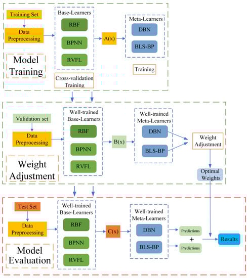 - Weight adjustment between meta-learners: We obtain a new dataset B(x) from the predictions of the base learners on the validation set, and utilize B(x) to adjust the weights between the meta-learners. The weights between the two meta-learners are updated according to the error between the predictions and the labels.