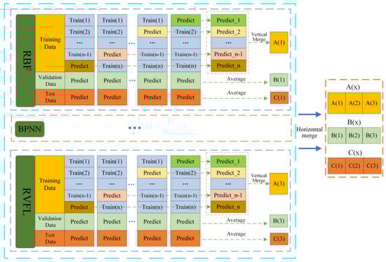 - Model training: We choose RBF, BPNN, and RVFL as the base-layer learners. After each model is pre-trained, we train the base learners with {Train(i)| i = 1, 2, …, n}, in turn. We make the base learners well-trained with the i-folder cross-validation method, as shown in Figure 5. We generate an intermediate dataset A by vertically merging the n predictions of the base learners. Specifically, we name the datasets generated by RBF, BPNN, and RVFL as A(1), A(2), and A(3), respectively, and merge these three datasets horizontally to obtain A(x). We use DBN and BLS–BP as our meta-learners and train the meta-learners on A(x). We repeat the above process for the validation set and the test set using the well-trained base learners to generate two intermediate datasets B(x) and C(x), where x∈{1,2,3}.