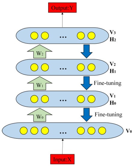 The DBN [] is a deep neural network model composed of a stacked RBM and a layer of BP network, and it is also a current mainstream neural network. The structure is shown in Figure 6. The training process of the DBN includes two steps: