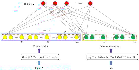 As shown in Figure 7, the BLS [] consists of four parts: input, feature node, enhancement node, and output. In fact, the network performance of the BLS after two training steps is insufficient. We establish the links between the output and input of the network, and fine-tune it by backpropagation. Based on this idea, this paper designs an improved BLS variant, namely, BLS–BP.