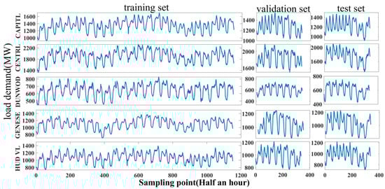 To demonstrate the effectiveness and robustness of our model, we conducted experiments on five datasets collected in the United States between 2017 and 2019. All datasets were from five regions in the US, and were called CAPITL, CENTRL, DUNWOD, GENESE, and HUDVL. The dataset sampling interval was 30 min, meaning that one day covers 48 load data samples. Figure 8 shows the load data in March to demo the training mode of similar-days [] prediction in this paper. We selected the similar-days period data of different years to divide the training set, validation set, and test set. Before starting the experiment, we normalized the sample data to the range [0, 1] to eliminate the dominant effect of those data with large values.