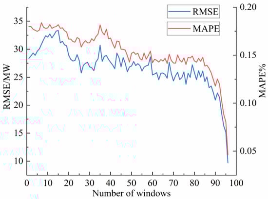 We performed hyperparameter exploration before we started our formal experiment. In our data pre-processing, the window size of the sliding-window algorithm was critical to the final performance. To ensure the optimal window size, we applied the controlled variable method, and adopted RMSE and MAPE as the evaluation metrics. According to the test results in Figure 9, we can see that our model has the smallest RMSE and MAPE when the sliding window takes the value of 96, indicating that the model has the best prediction performance. Since there are 48 samples of load data in a day, and the size of the window needs to be an integer number of days, we need to consider the practical significance of the window size representing a specific time interval. Therefore, we determined the optimal window size for the sliding window to be 96.