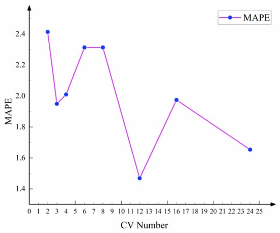 In the cross-validation (CV) module [], an error experiment was carried out to filter out the number of CV folds with the smallest error. We utilized MAPE as the evaluation metric, and plotted the figure of error lines with regard to the power load in the spring for CAPITL. As shown in Figure 10, when the CV is too small, the empirical error is large and the model is not robust. When the CV is too large, the experimental error is not reduced, although the computational effort increases greatly. We set CV to 12 as a compromise of the computational effort and the model prediction performance. Table 1 shows the optimal parameter settings of the machine learning methods used for comparison after many experiments.
