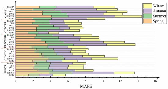 In this experiment, we took five single machine learning methods as baselines, and the results are shown in Table 2. We emphasize the prediction results of our model using the grey background. We can observe that our model outperforms the baselines in each sub-dataset. Specifically, our model can achieve an outstanding performance even when the power load time series is nonlinear and non-stationary (see CAPITL and CENTRL for example). Although DBN can already make good predictions, the improved BLS proposed in this article even has a prediction error less than that of the DBN in many cases. The results demonstrate that the regression-based BLS has an effective predictive ability. In addition, our model significantly outperforms other baseline models. In Figure 11, we can also observe that the proposed method has the lowest MAPE, demonstrating the effectiveness and robustness of our model. The proposed method achieves the best performance in all datasets and forecasting steps. The forecast curves of the various methods on Christmas Day are shown in Section 4.5.