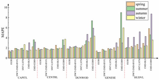 To date, a variety of hybrid models have been proposed for short-term load forecasting. We took four models as the baselines for our model: DWT-EMD-RVFL [], SWT-LSTM [], EMD-BLS [], and EMD-EDBN []. The empirical results show a similar trend with previous experimental results: the proposed model outperforms the hybrid models for each dataset in all forecasting horizons. The respective error experiments are shown in Table 4. We can observe that the EMD-EDBN model has the worst results for all datasets in all forecasting horizons. Figure 12 shows that our method has the smallest errors on each sub-dataset, demonstrating the effectiveness and robustness of our model. The forecast curves of various methods on Christmas Day are shown in Section 4.5.