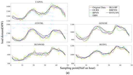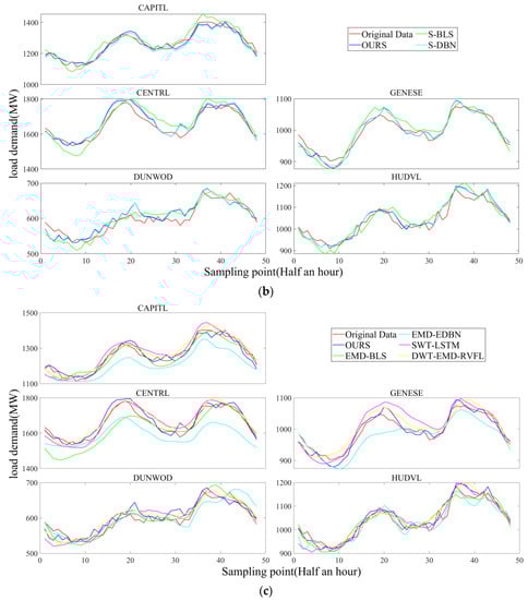 This section selects a special day in the United States—Christmas—to analyze the performance of the model. Figure 13a–c show the prediction curves of three groups of comparative experiments on Christmas Day. The figures show that although other models can effectively predict the load in some regions where the original electric load increases and decreases steeply, there are still large errors in the prediction results in the regions where the original electric load curve fluctuates widely at the peaks and valleys. In contrast, the load prediction curve of the hybrid network proposed in this paper can fit the original power load curve well. It can predict well even in some areas with large fluctuations of the original power load curve, as well as peaks and troughs. This shows that the method proposed in this paper has strong robustness.