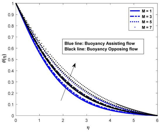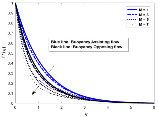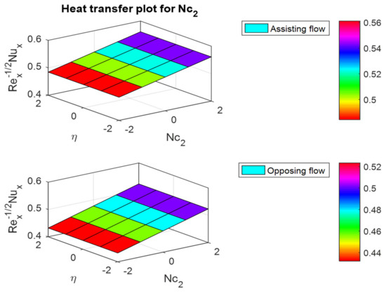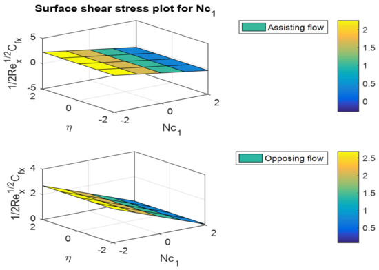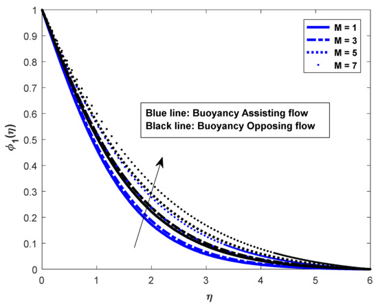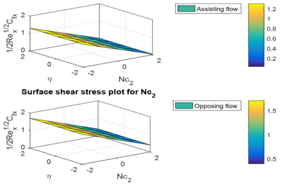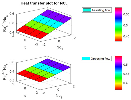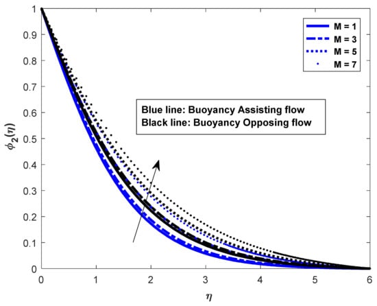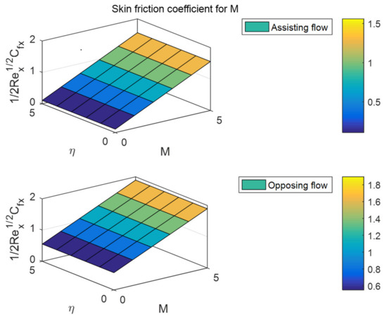 The and plots for different values of the magnetic field parameter M are shown in Figure 25, Figure 26 and Figure 27. Figure 25 shows that as the value of increases, is enhanced at a rate of 0.290386 or 0.26876 . Similarly, for assisting and opposing flows, heat and mass transfer coefficients decrease at rates of −0.0235 and −0.02999, and −0.02286 and −0.02946, respectively. Due to the buoyancy force, surface shear stress is greater in assisting flow than in opposing flow.