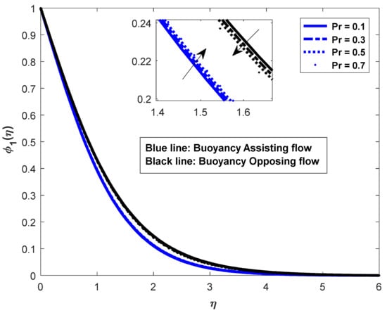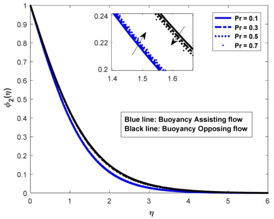 The influences of the Prandtl number are seen in Figure 5, Figure 6, Figure 7 and Figure 8. The dimensional velocity profile grows as the Prandtl number increases in the opposing flow case and reduces in the helping flow case, as seen in Figure 5. In contrast, in the natural convective flow of a regular fluid over a vertical surface, the thickness of the hydrodynamic boundary layer reduces as the Prandtl number grows, and the vertical flow velocity drops. It is worth noting that, unlike in the classical analysis of natural convection on a vertical surface, where the Prandtl number appears in the energy equation, the Prandtl number appears in the momentum equation in the present analysis and thus has a different effect on the velocity profiles than in the classical velocity profiles. The same phenomenon can be seen in the salt_1 and salt_2 concentration profiles (see Figure 7 and Figure 8). The temperature profile falls as the Prandtl number grows, as shown in Figure 6. An increase in the Prandtl number reduces the thermal boundary layer thickness, since the Prandtl number signifies the ratio of momentum diffusivity to thermal diffusivity. In heat transfer problems, controls the thicknesses of the momentum and thermal boundary layers.