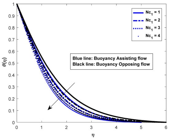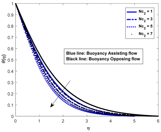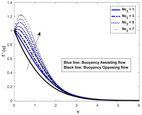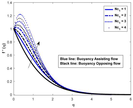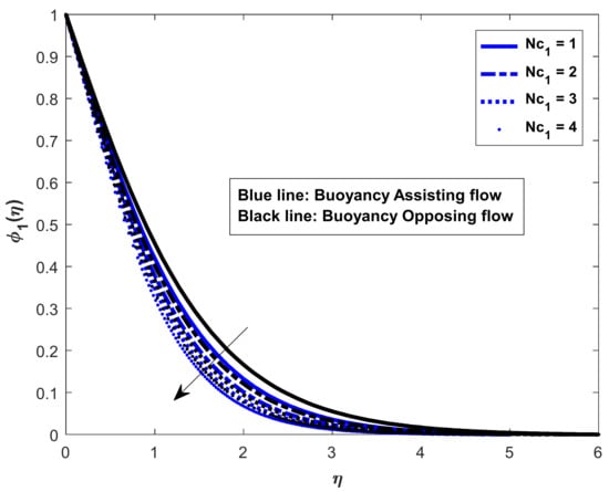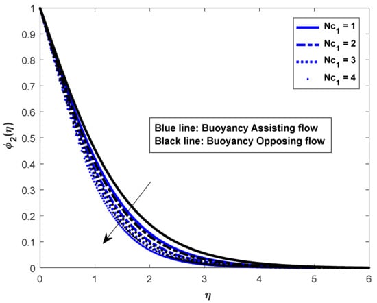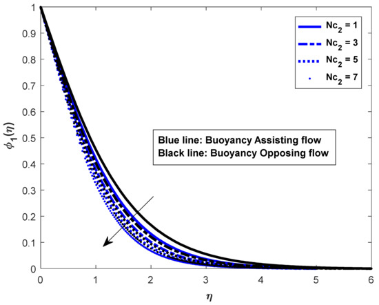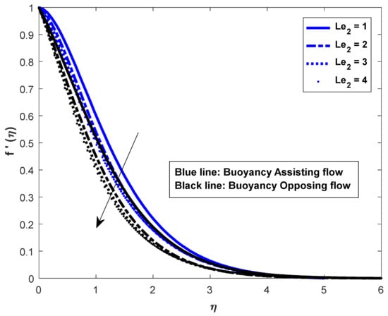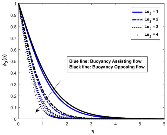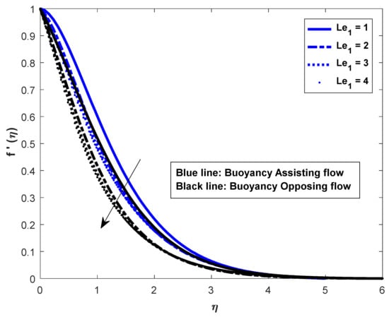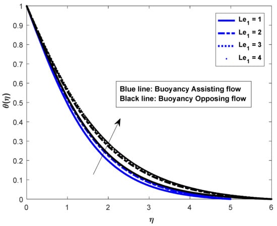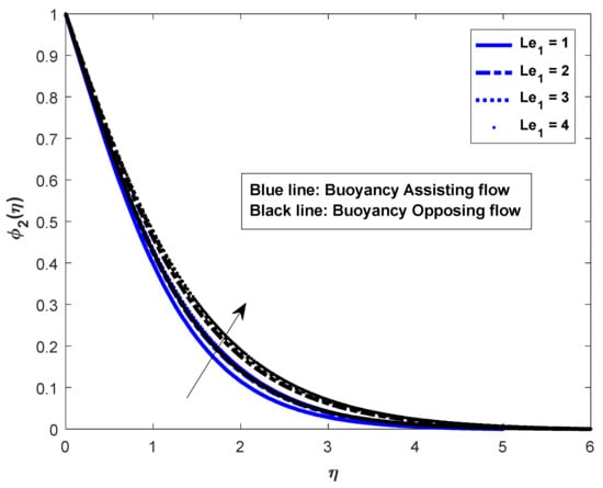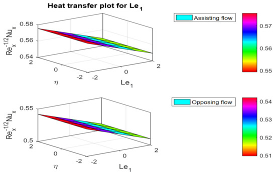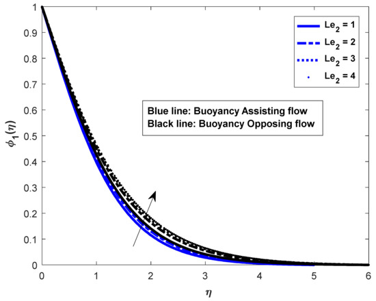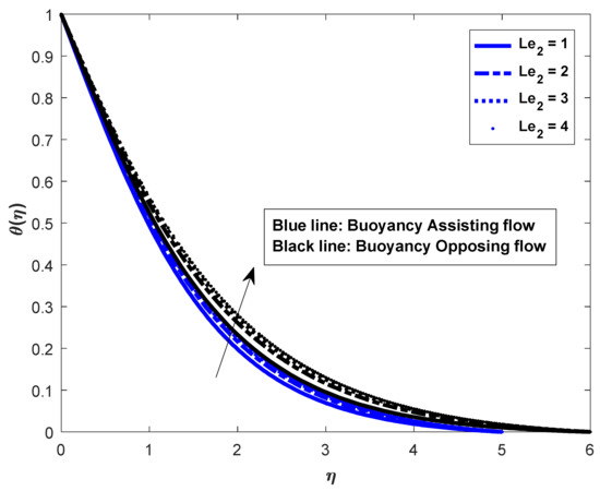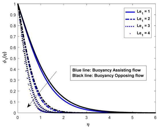 - In the assisting flow case, the dimensionless concentration rises as the Lewis number rises; for buoyancy, the opposing flow case also remains the same.
