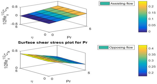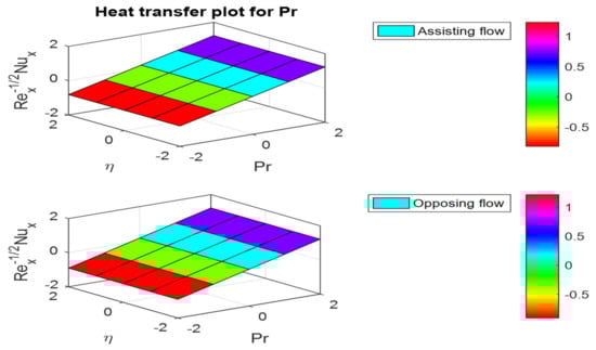 Figure 31, Figure 32 and Figure 33 depict the friction factor coefficient, , and plots for different values of . Figure 31 represents that for increasing values of , the friction factor coefficient decreases in assisting and opposing flow cases. The rates of and rise as the Prandtl number increases in both cases.