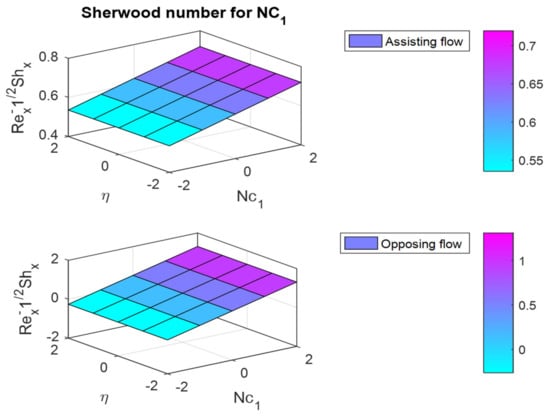 The skin friction coefficient and plots for different values are shown in Figure 28, Figure 29 and Figure 30. As grows, increases in assisting flow and falls in opposing flow, as seen in Figure 28. The Sherwood number exhibits opposite behavior (Figure 30). However, in both fluid flow cases, is increased (Figure 29).