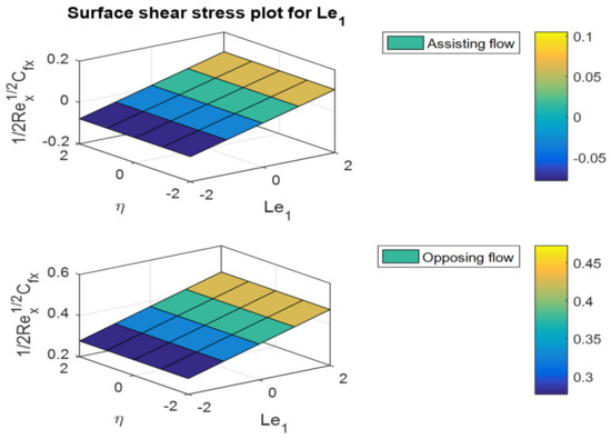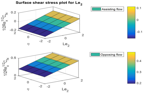 Figure 41, Figure 42, Figure 43 and Figure 44 illustrate the shear stress, Nusselt number, and salts_1 and salt_2 Sherwood number plots for different values of Lewis number . Figure 41 shows that increasing values of escalate in both fluid flow cases. The Nusselt number is decreased in both flow cases. Finally, the salt_1 Sherwood number decreased and the salt_2 Sherwood number increased in both assisting and opposing flow cases.