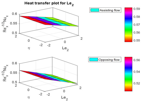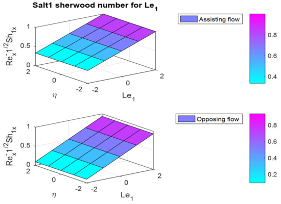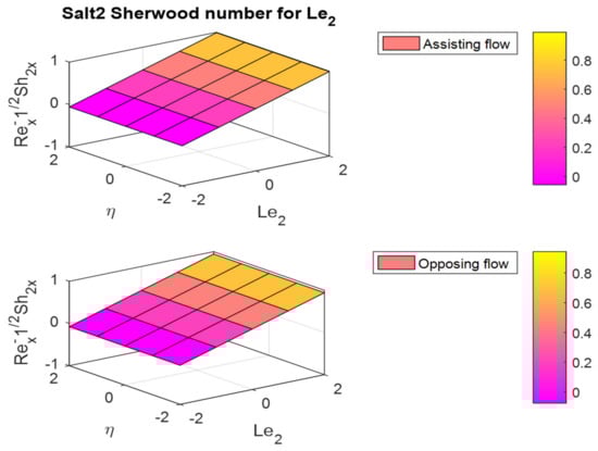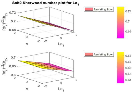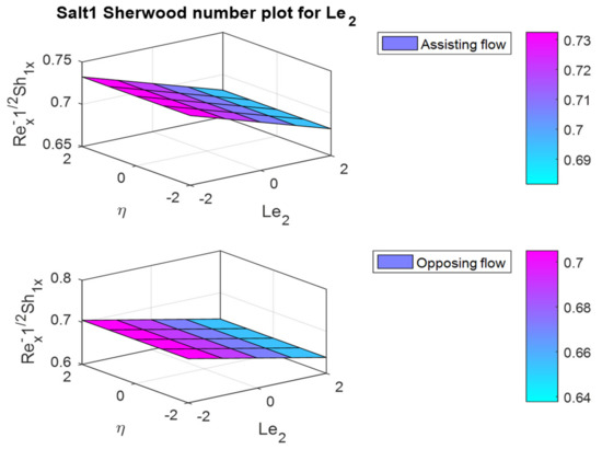Figure 37, Figure 38, Figure 39 and Figure 40 illustrate the shear stress, Nusselt number, and salt_1 and salt_2 Sherwood number plots for different values of Lewis number . Figure 37 shows that for increasing values of , the skin friction coefficient increases at 0.045962 (assisting flow) and 0.048975 rates. The is decreased at the rates of −0.00653 and −0.00881 in the fluid flow cases. The salt_1 Sherwood number for the Lewis number is increased in assisting and opposing flow cases, whereas the reverse trend can be observed for salt_2 Sherwood in both cases.