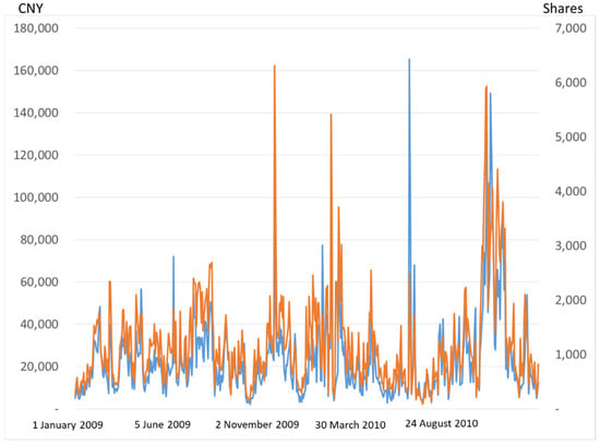 The brokerage tapes include date, order price in CNY, type of order “buy” and “sell”, as well as the order’s volume. They did not have a timestamp in the years 2009–2010. Further on, we attribute separate spreadsheets as the “tapes” of fictitious traders from zero to four for all brokerages to conduct a natural experiment. As we can see from the data in Table 1, summary statistics for individual traders are comparable and we treat them as an extra level of randomization of our data. We plot the stock volumes and prices from one of the tapes in Figure 2. Visual inspection confirms an overall growth in trading throughout the two years, which is not surprising for a developing stock market, and includes a few spikes but no other obvious tendencies.