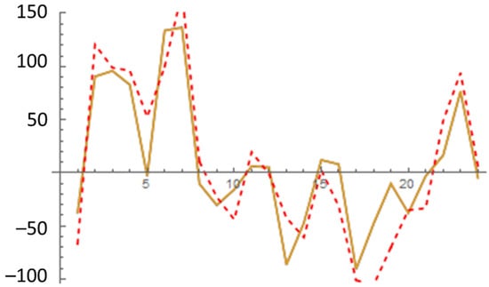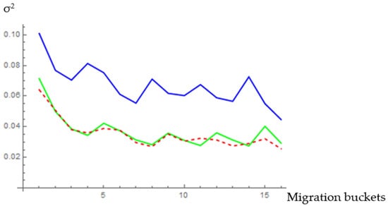 In Equation (8), we retained the multiplier and 1/T, T = 484 (trading days) in the denominator as well as the numerator for clarity. Index n = 1 ÷ 16 numbers a vector of the state-space. A typical plot of variances of the predictor and the residual is given in Figure 4.