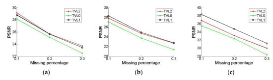 where refers to the total variation of the image, is the l2-norm in , and is a scalar parameter balancing the TV regularization term and the fitting term. plays the role of regularization, incorporating additional a priori knowledge into the problem to convert the ill-poised problem into a well-posed one or select one from the infinitely possible solutions. The fitting term based on l2-norm can be used to penalize inconsistency between the observed image and the estimated image. They perform well on some geometrical information and reduce Gaussian noise and other oscillations (e.g., Gibbs’ phenomenon). The experiments show that the TVL2 model can recover the missing wavelet coefficients, while preserving the geometrical features in pixel domain.