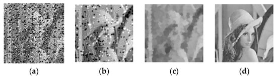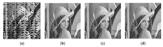 10% wavelet coefficients of Lenna are randomly lost. (a) received image. (b–d) images reconstructed by TVL2, TVL0, and TVL1, respectively.