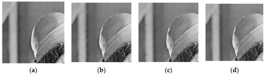 Zoomed portions of the original and reconstructed Lenna. (a) original image. (b–d) images reconstructed by TVL2, TVL0, and TVL1, respectively.