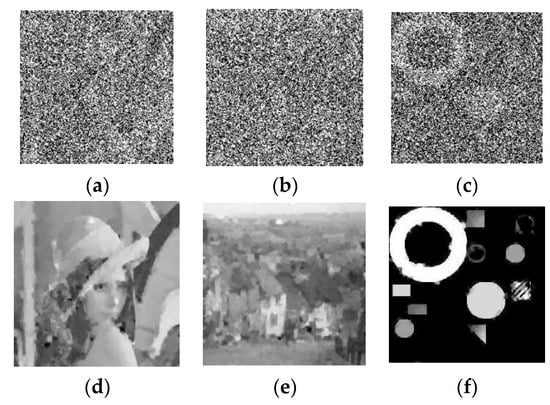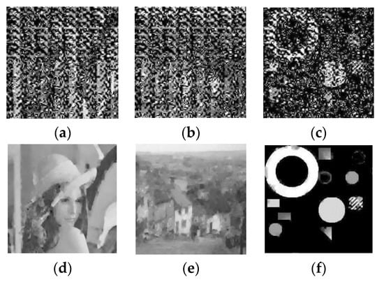 30% wavelet coefficients are corrupted by salt-pepper noise and 10% coefficients are lost. (a–c) received images. (d–f) images reconstructed by TVL1.