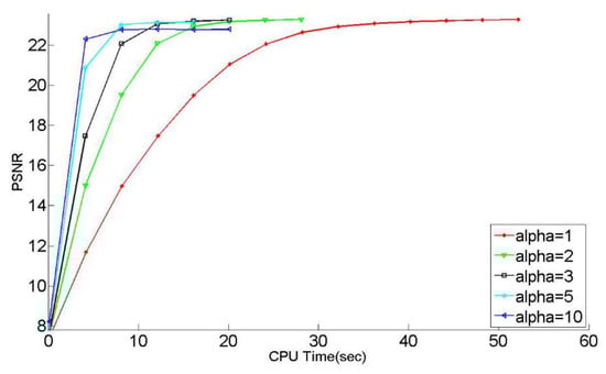 The final experiment is to discuss the parameter , which plays an important role in Algorithm 1. The value of determines how well the Moreau envelope approximates the function in (11). In the following, we experimentally investigated the performance of Algorithm 1 with different . In this experiment, 5% of the acquired wavelet coefficients were randomly corrupted by salt-pepper noise, and 10% of corrupted coefficients were lost. The PSNR value is shown in Table 1. We can see that the solution of the modified model with a smaller is a better approximate solution of the original model in term of objective metric (PSNR). Meanwhile, we show the plot of PSNR against CPU time for Lenna image in Figure 8. The faster convergence rate is shown with a larger . According to the above two laws, we suggested that the researcher can make a reasonable choice according to the needs of the application.