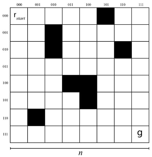 In relation to (14), we chose to work with square maps where n is a power of two. This choice is motivated by the following reasons: from (14), in the case that n was not a power of 2, the ceiling function would still round up the resulting number of qubits, with the states from through being unused, leading to a waste of qubit utilization; also, binary encoding words of length offers convenient symmetries when working with them, allowing optimizations and lowering the design complexity of the quantum algorithm, as we shall see in the implementation sections. Considering that the positions can be referred with row and column indexes, the position code takes the form , where the first half of the position code is related to rows while the second half encodes the column coordinates. Since n is a power of two, it is always possible to split in exact halves the position code.