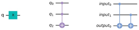 Figure 3. Structure of the gates as quantum circuits. From left to right: the X gate; the Toffoli, and the XOR gate. The target qubit of the Toffoli gate, , stores the values . For the gate, stores . In the last two cases, in order to preserve the actual value of the operations, the qubits that store the result, namely and , are initialized to , so that their state after the gate is simply and .