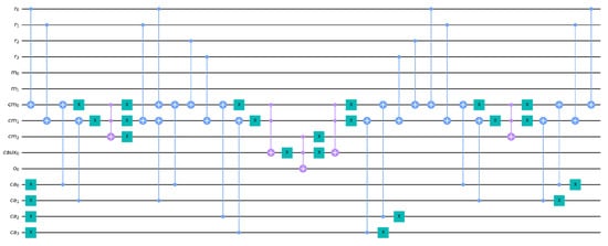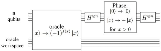 This is a convenient formulation, since the diffusion operator is standardized and not problem-specific, as opposed to the oracle , whose design is the main concern when applying Grover’s algorithm to a problem. The complete structure of a Grover operator G is represented in Figure 5. Grover’s quantum search can be carried out with oracle calls, as expressed in (5), and since it is proven that no search algorithm can achieve a complexity lower than , or it is , we know that the Grover procedure is optimal [21,37].