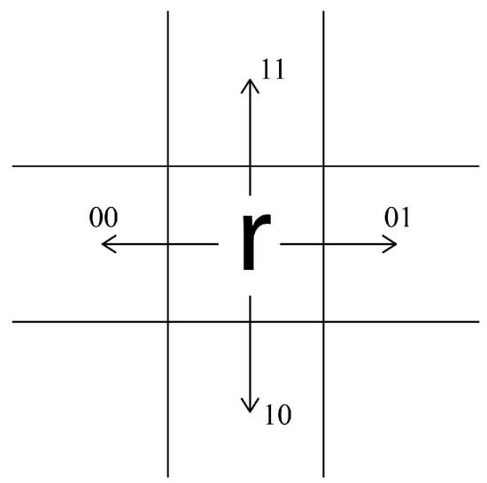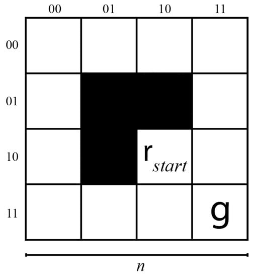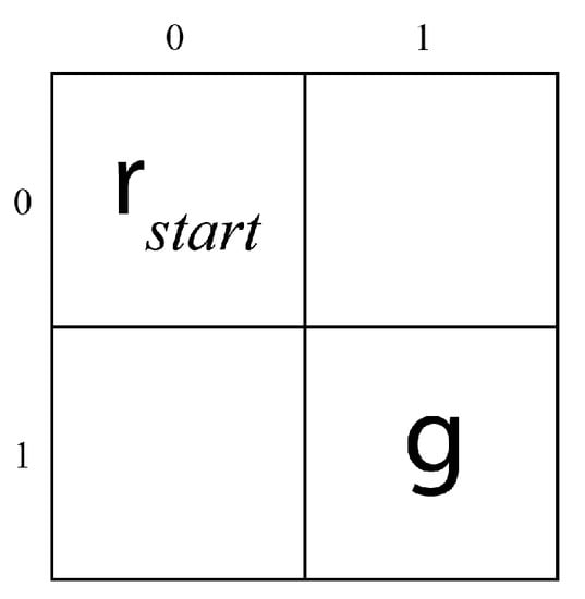 A simple case for the planning of the path of a robot is represented by the case where the map has only four possible positions, each one of them being encoded with 2 bits of information, with representing the starting cell, while a different represents the goal position. Our objective is finding the actions that can bring the robot from to . A plot of this environment is shown in Figure 6. The position along the rows is encoded by a single bit , while the column index is represented by . In such a map, movement can be encoded with a single bit , similarly to what is performed in [7], where motion is interpreted as a clockwise or anticlockwise rotation; the i index of is such that , being the total number of actions in the path.