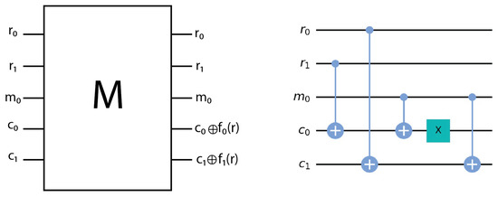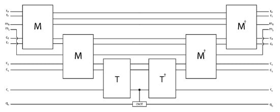 The output register is, therefore, composed of the starting input values, together with the updated position, stored in the bits. Figure 7 shows the reversible M block and its corresponding quantum circuit implementation, where the register is to be considered as initialized in the state (as it will be for every other auxiliary qubit).