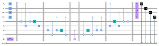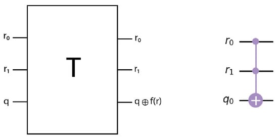 In the general description, the oracle typically presents an additional gate that controls the oracle qubit within the T operator, as seen in Figure 9, but for the implementation of this specific case, we considered that no additional qubit to be flipped is needed, since we can adopt the third input of the Toffoli gate as the marking qubit, sparing the additional control.