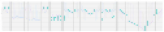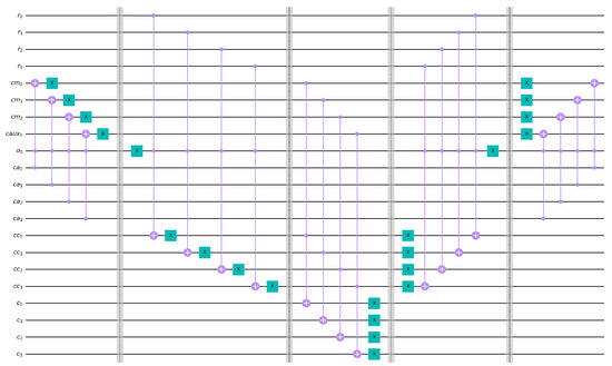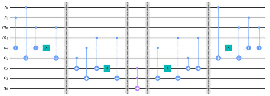 Expression (1) sums up the aforementioned strategy for the adaptation of traditional logic to a quantum network: we take advantage of the universality of the set by reducing the classical combinatorial logic in terms of these operations, and then replacing them with their quantum equivalents, , which are thereupon also universal [28]. In consideration of the fact that the C set is functionally complete, any other set that contains it must also be complete, this is why, for convenience reasons, we also incorporate the gate in our translation scheme, since it is a recurrent operation in our path-planning logic and it is useful to have a fixed reference to it and its quantum gate realization. Not unexpectedly, there exist many universal sets of quantum gates [21,29], some of which have elements that do not have a classical logical analogue and that can also be used to design a quantum algorithm that solves problems of the same kind. Nonetheless, they might not be as suitable in respect of design complexity concerns, in the sense that traditional logic offers a more solid frame of work to build highly-composite networks, along with well-explored optimization techniques that are particularly significant in the context of quantum algorithms, as discussed in Section 7. Additionally, out of the set we considered only , the Toffoli gate, that is a non-Clifford gate, since it is built on T gates ( rotation about the Z axis), which do not belong to the Clifford group [30]. The Gottesman–Knill theorem [31] states that gates outside of the Clifford group cannot be efficiently simulated by classical machines, therefore, a quantum circuit that minimizes the number of non-Cliffords gates can also benefit from better-performing classical simulations. In the implementations of Section 4 and Section 5, we show that indeed the great majority of heavy-duty computation is composed of the X and Clifford gates, with the Toffoli gate being involved mainly in aggregation and marking operations, which are much rarer if compared to the actual computation of the movements and position of the robot in the path-planning procedure.