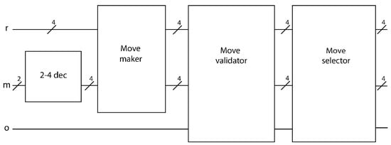 The M block is the quantum computational operator that updates the current position of the robot, represented by , according to the value of the move ; it also takes as input and , the auxiliary qubits needed to achieve reversibility of the operation, whose job is that of storing the evaluation result that would otherwise overwrite the information of the position and move inputs. The new position is provided as the outputs and , whose expression has been extracted directly from the examination of the resulting cell that the individual moves bring the robot into, converting the behavior described in Table 1 to the Boolean expressions of (16).