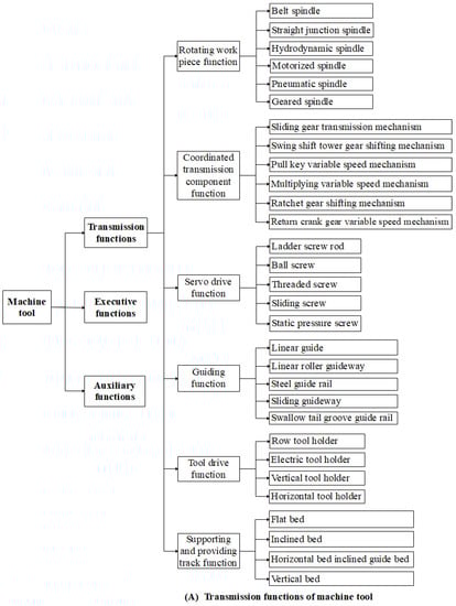 In tree topology mapping, the mapping process is represented by the hierarchical structure of function domain and method domain. The process model of product design scheme generation while considering remanufacturing can be supplemented by the tree topology mapping process. Therefore, this section specifically analyzes how the tree topology mapping process generates the process model by applying a product design scheme. The details are shown in Figure 5 (“AND” relationship between functions and “OR” relationship between methods). The steps of the generation of candidate design scheme were as shown below: