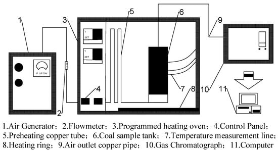 A programmed warming experiment was conducted on the coal samples, and the device included a programmed warming–gas chromatography system, as shown in Figure 1. A 60~80 mesh coal sample of 60 g was put into the coal sample tank. The air generator and flow meter were connected to the bottom of the coal sample jar to provide a continuous and stable oxygen supply for the coal sample, and the air flow rate was 100 mL/min. The programmed heating oven set the programmed heating rate from room temperature to 30 °C for 10 min, and the constant temperature was maintained at 30 °C for 20 min, and then increased to 240 °C at a rate of 0.6 °C/min. The temperature probe monitors the coal sample and the gas temperature in the jar in real time. The gas samples were collected at 10 °C intervals, and the collected gas samples were connected to the gas chromatograph for the analysis of O2, N2, CO, CO2, CH4, C2H6, C2H4 and so on; finally, the data were exported through a computer. The changes in temperature, outlet oxygen concentration and generated gas concentration in the process of coal warming were recorded, and the coupled model of oxygen consumption rate of relic coal under different temperature and oxygen concentration conditions was established based on the experimental data to calculate the oxygen consumption rate in the process of coal warming.