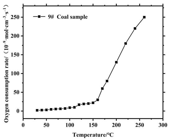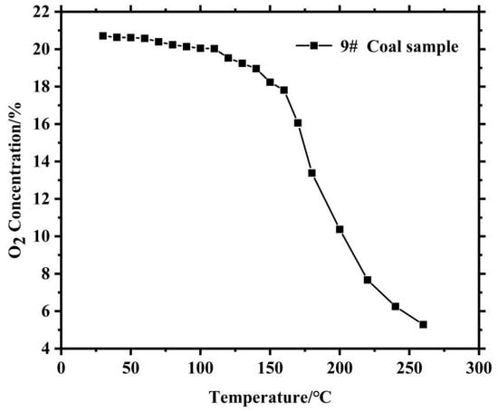 From the above graph, it can be seen that the oxygen concentration shows a decreasing trend with the increase in temperature, which indicates that there has been oxygen consumption of the coal sample during the warming process. At the early stage of warming and oxidation, the oxidation reaction was not strong, and the oxygen concentration did not change significantly; after 160 °C, the oxidation reaction gradually accelerated, and the oxygen concentration decreased sharply.