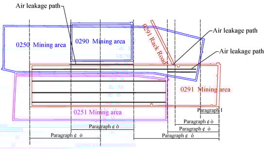 As a mine 0291 workings face a complex environment in the near mining area, with the initial mining position of nine coal seams as the starting point, the overlying 0250 mining area in a 0291 mining area, the strike coverage area is 76~610 m, the tendency coverage area is 100~142 m. The 0291 shelf road is located towards the workings towards 132~137 m; the overlying 0251 mining area strike coverage area is 165~610 m, the tendency coverage area of 0~95 m; the adjacent 0250 mining area on the return wind side tendency coverage area is 280~490 m. Under the influence of mining, the top plate fissures will connect with the overlying and adjacent mining areas to form fissures, and these fissures will form wind leakage paths because of the pressure difference between mining areas. In order to more accurately study the impact of wind leakage from the adjacent mining area on the spontaneous combustion “three zones” in the 0291 mining area, segmentation simulation is proposed. The segmentation situation is shown in Figure 5.