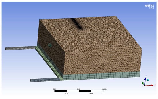 Combined with the actual situation of the mine, the ventilation method is a “U” ventilation, and the mining area is divided into a bubble zone and fissure zone, the height is calculated by Formulas (15) and (16) and the physical model of the mining area is established. The size of the inlet and return air tunnel is 50 m × 3 m × 4 m; the size of the working face is 142 m × 4 m × 4 m; the bubble zone is 142 m wide and 10 m high; the fissure zone is 142 m wide and 40 m high. The grid is divided into a hexahedral grid, with a single grid size of 2 m in the mining area and a single grid size of 1 m in the inlet and return air tunnel and the working face area and the grid of the air leakage path is encrypted and refined to ensure the accuracy of the simulation, as shown in Figure 6.