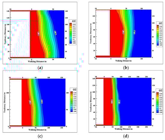 Oxygen concentration distribution in the mining area of stage I~IV: (a) Stage I, (b) Stage II, (c) Stage III, (d) Stage IV.