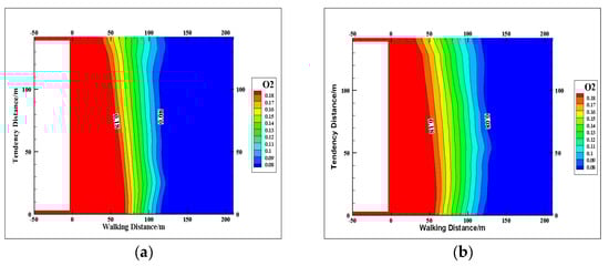 Oxygen concentration distribution in the mining area of stage V~VI: (a) Stage V, (b) Stage VI.