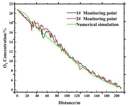 From the above table, it can be seen that the 1# monitoring point monitors oxygen concentration at 18% at a distance of 26 m from the working face and monitors oxygen concentration at 8% at a distance of 144.5 m from the working face, which results in the width of the oxidation zone monitored at the 1# monitoring point being 118.5 m. Similarly, the width of the oxygen zone monitored at the 2# monitoring point is 115.5 m. Numerical simulations were conducted for 186~396 m of the mining area. In order to more intuitively show the comparison results, four coordinate points (26, 139), (27, 112), (144.5, 139), (142.5, 112) with oxygen concentrations of 18% and 8% of the beam pipe data were plotted into the simulation results, as shown in Figure 10.