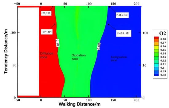 Oxygen concentration, heat accumulation and wind speed are the main factors influencing the spontaneous combustion of coal left in the mining area. Since the current underground beam tube monitoring system can only monitor the gas concentration in the mining area, in order to compare with the beam tube data to determine the accuracy of the numerical simulation, the division of the “three zones” of spontaneous combustion in the mining area in this paper only considers the distribution of oxygen concentration. Therefore, only the distribution of oxygen concentration is considered in this paper. Thus, the range of the “dispersal zone” is , the range of the “oxidation zone” is and the range of the “asphyxiation zone” is .