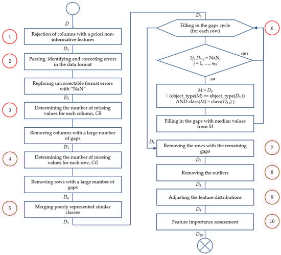 Figure 1 highlights the steps of the 1st iteration of the data preprocessing algorithm (number in red circle means step number, Section 2.2 and Section 2.3 contain step descriptions). This section provides a more detailed description of the actions taken (designations are employed as follows: D is the initial dataset, cutrow(A, b) is removing rows with numbers from vector b out of matrix A, cutcol(A, b) is removing columns with numbers from vector b out of matrix A, and nk and mk are the numbers of rows and columns in matrix Dk, respectively).