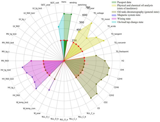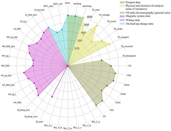 During preprocessing, power transformers are assumed to be not physical objects but information objects in the data space (feature space) represented by a data area diagram, so dataset visualization is performed taking into account this assumption. A data area diagram reflects the number of non-void entries in the dataset for all the features under consideration. Such a data diagram allows one to graphically assess the observability of the developed equipment model, both in terms of the individual constructive parts and subsystems and in terms of the contribution of each parameter (feature) into the overall power transformers’ observability when considering it as a single technological unit.