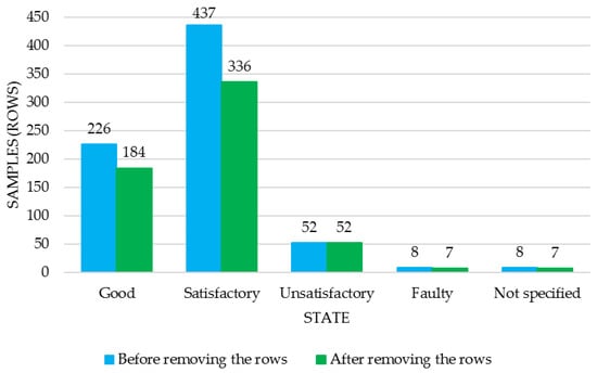 Step 7. There are cases when the missing values cannot be filled in at Step 6 due to the fact that the dataset does not contain the necessary data, i.e., there are no attribute values for a certain type of object and its state. Therefore, it is needed to remove the rows with the remaining gaps.