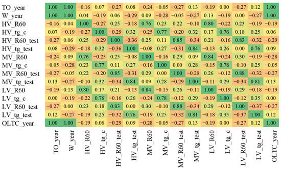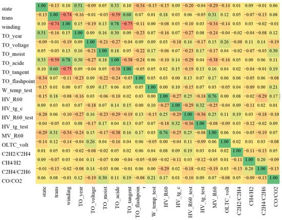 - Spearman correlation analysis made it possible to identify features with high collinearity. From each group of such features, only the one most correlated with the target variable was left. Collinear feature minimization reduces the model’s overfitting risk, while keeping the learning rate at a high level. By training a decision tree ensemble classifier giving the features’ importance, the excluded features were confirmed to be not significant for power transformer technical state assessment.